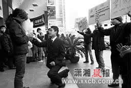 据其中一名穿着笔挺的深蓝色西装、系着领带的男子介绍,他叫卓晓勇,张家界人,今年29岁,在长沙五里牌一家公司做事。3年前,通过朋友介绍,他认识了女友——中国移动通信小吴门通信店的营业员郭彩霞,但双方关系一直没有到谈婚论嫁的地步,由于父母亲催得急,考虑到元旦是一元复始、万象更新的日子,他想争取在新年第一天,赢得芳心,抱得美人归。