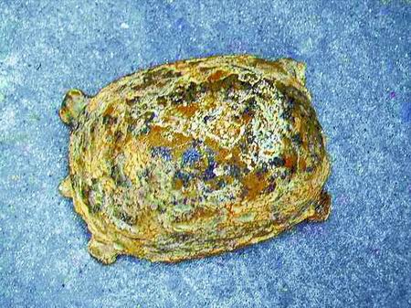 这个龟化石长约15厘米,宽约7厘米,四肢和尾巴完整,身上颜色呈铁黑色,没有头部(如图),重约1公斤。