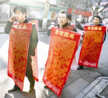 昨日上午,硚口区宝丰二路一居民楼下,5名农民工身披“字书衣”讨薪,引来众多路人围观。记者近距离观察,发现该“字书衣”由两片长1.5米左右、宽0.5米左右的硬塑料布组成,记述了13名农民工讨薪三年以及被人持枪打伤的经过,塑料布上还留有农民工代表及包工头的联系方式。