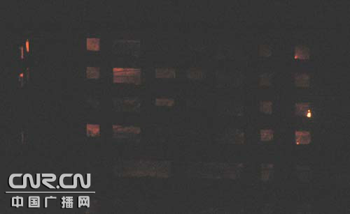 记者在现场看到,德汇国际广场主楼仅剩下楼体框架,昨天上午被殃及起火的德汇大酒店大火由于楼层太高,高压水龙头射出的水柱够不到大楼顶部,无法灭火,只能任其自燃。目前,20层的德汇大酒店最上面的6层楼大火仍在燃烧,透过被大火烧毁的几十个窗口望去,大楼内火光耀眼,不时有火焰和浓烟从窗口向外喷出,但火势明显减弱,彻夜燃烧的大火仍未熄灭。武警官兵、公安干警仍冒着零下20度的严寒和大风坚守在火灾现场警戒。