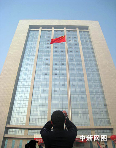5日上午,鲜艳的五星红旗在新落成的山西临汾市公安局作战指挥中心大楼前冉冉升起。作者:刘一