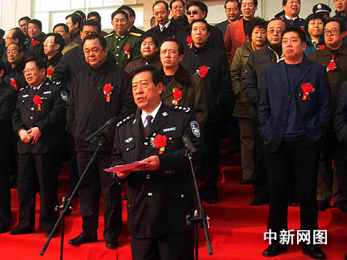 山西省省公安厅党委副书记、常务副厅长李连琪在山西省临汾市公安局作战指挥中心启动暨升国旗仪式上致词。作者:刘一