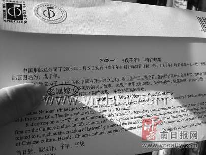 记者随后来到楚雄集邮经营部,花了2.2元也购买了一枚《戊子年》特种邮票首日封。该套首日封编号为2008-1,印量30万枚,封上还加贴了中国集邮总公司的防伪标签。当记者向工作人员询问首日封文字中出现的错误时,这位工作人员显然完全不知情,经提醒看到后,她连连表示,这样的情况以前从未发生过,这还是头一次碰到。她随即拿出和首日封一起配套发行的一套鼠年邮票仔细查看,记者注意到,上面有首日封设计者于平和任凭的介绍,并且在多处出现了“老鼠嫁女”的字样,但并无任何差错。据工作人员介绍,首日封在楚雄的发行量仅70枚,目前已销售了近40枚。(王维娜 摄影报道)