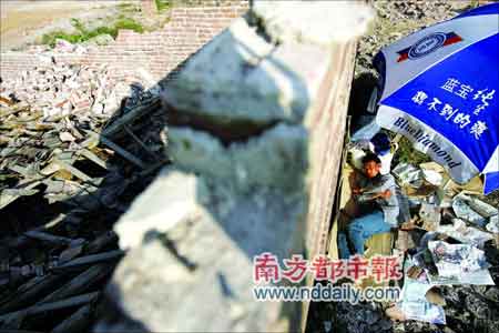 在石龙镇王屋洲南岸二桥的右侧,一圈铁皮将上万个平方的面积圈了出来,其内大多是一片残砖破瓦的废墟。引人注意的是,在废墟的正中央有间孤零零的砖房。房子的屋顶已经完全塌倒在地,而房子的左右墙壁并没有被完全推倒。在铁皮圈的另一侧,还有两间砖房孤独地竖立在铁皮圈内。在已被拆除屋顶的房子前,几张硬纸箱叠在一起,旁边有一大袋毛衣。“我现在每天晚上都住这里”。说这话的是石龙镇王屋洲62岁的村民郑光华。