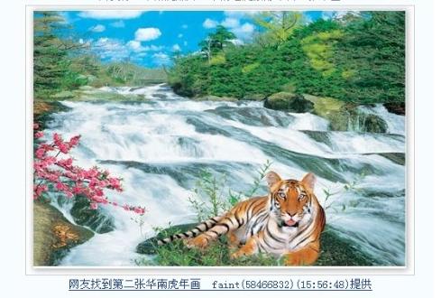2、2007年11月15日晚九时许,网友"攀枝花xydz"在色影无忌华南虎临时论坛里发帖称:"老虎是假的。我今天仔细看我家的一副挂在墙上的老虎画,除了耳朵不一样,哪里都是一样的,连老虎的纹路都是一样的。但我不知道怎么传图,我已经照下来了。"