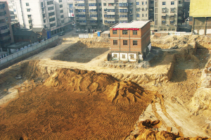 1月8日,河南省焦作市某旧城改造工地上矗立着孤零零的一栋楼。焦作市升恒房地产开发公司于2003年启动旧城改造项目的开发,由于一户搬迁户要求赔偿数额同开发商不能达成一致,成为了坚持到底的“钉子户”。几年来,双方始终未达成协议。耽误不起工期的开发商先行对其他位置进行开发,从而形成了如今的场景。宏航 摄