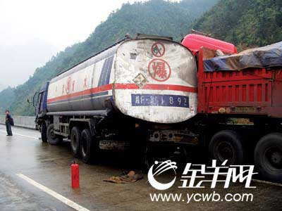 事故发生在昨天上午8时左右。邓某告诉记者,当时红色牵引半挂车上共有他、同伴和司机三人,事故发生前司机赵某发现车辆制动失灵,赵某一人连忙跳车逃生,失控牵引半挂车随即和前面的白色罐体车相撞,坐在副驾驶位的同伴在两车碰撞挤压中受伤,已送往医院救治。据交警称,他们联合路政和消防在现场沿途寻找,却未发现驾驶员赵某的行踪,寻找仍在继续。