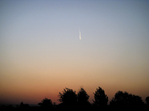 网友“20231”在帖子中回忆:他家住在离机场不远的地方,昨天早上7点40分,他打开窗帘,朝正东方向机场上空看去,突然看到空中有一个发亮的不明物体。由于距离远,看不出不明物体是否在移动。它一直停留在空中,颜色逐渐变淡。用相机拍下来后大约过了5分钟,物体消失了。从照片上看,它拖着一根长尾巴,被朝阳照得发亮,但看不清头部是什么模样。