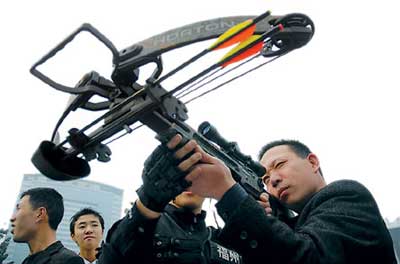 据介绍,警用弓弩重4.2公斤,配备了一个瞄准镜,有效射程50米。警用弓弩具有很强的杀伤力,它射出的弹头击中目标后会散开,不能再拔出来,因此一般不会轻易使用,只有在遇到重大的暴力犯罪,枪械又无法使用时,才让它出场。