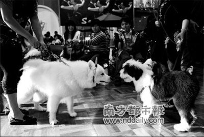 现场一下子要请来几十名狗狗,真不容易。狗主们各显神通,有的拿包包当工具,有的直接抱进来的,训练有素的狗狗则直接跟在主人后面闪亮登场了。它们在现场看到这么多同类,都好奇地互相打量,小心翼翼地上前用鼻子嗅嗅,算是问个安了。