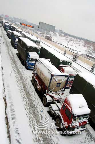 1月13日,九江下起了近10年来最大的一场雪。这场大雪造成九江长江大桥交通堵塞。因为桥面结冰打滑还引发几起小的交通事故。为了安全起见,九江交警部门立即实施“封桥”,逾万辆车停滞在九江市境内。武警九江支队出动百名官兵,紧急疏通被阻交通。
