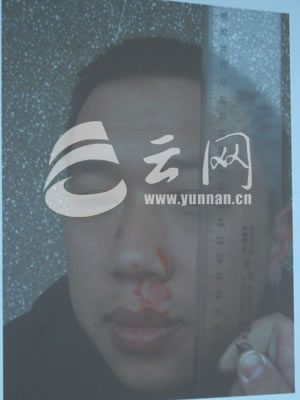 被打出鼻血的城管队员阎旭东(摄影 王琳)