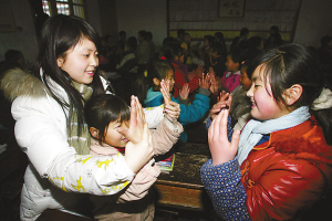 晚6时,东洲春蕾希望小学。住校的孩子们都已吃过晚饭,但停了一天的电依然没来。一阵哨子声响过,同学们又回到教室。一年级2班,数学老师姚川杰正和孩子们做游戏,教大家拍手和跺脚取暖。“如果感到快乐你就拍拍手!”跟着老师的节奏,孩子们的巴掌声响成一片。