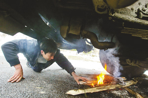 马嘴山上,一个被困在山上的卡车司机趴在车底生火为发动机解冻。