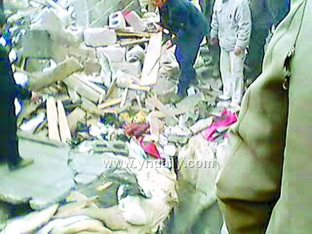 “嘭”的一声巨响,木板、竹竿、瓦砾、水泥渣四处横飞,呛人的火药味中,带血的断手断脚散落在地……昨日上午10时30分,昭通市镇雄县果珠乡果珠村街上社拱桥村民小组,一家庭式土制爆竹作坊,在用火药生产爆竹过程中,发生爆炸,作坊主人刘龙春及其舅子、丈母娘不幸被炸得血肉模糊,当场身亡,刘龙春的媳妇和四哥伤势严重,被及时送到医院救治。事发后,当地县、乡两级政府及有关部门迅速赶到现场,指挥人员排除二次爆炸隐患。