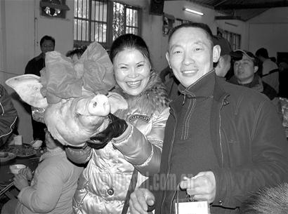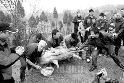 “好热闹,几百个人一起杀猪团年,抽的奖品全是猪肉!”昨日,尽管气温降到了2℃左右,南充西山 “西湖乐”农家乐却热闹非凡,一群素昧平生的网友从四面八方聚集在一起,举行杀年猪大团年活动,大家大块吃肉,大碗喝酒,还进行各种娱乐活动,抽到的最高奖品则是戴着大红绸缎的猪头。
