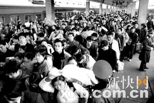 ■在广州火车站站台,旅客们纷纷踏上返乡列车。新快报记者 陈昆仑/摄