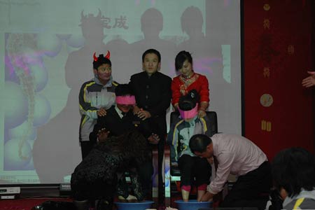 网友在帖子中描述说,几日前的一个下午,自己在北辰企业的表彰会上经历了一场感人场面,在文艺演出告一段落、主持人宣布表奖名单后,公司的两位经理上台为两位获奖员工颁奖,奖品是华东五市游和一套豪华床上用品,让所有嘉宾没想到的是,主持人神秘地令两人坐在幕帘后面,感动在场所有人的一幕发生了:两位公司经理正跪着为朦住双眼的两位员工洗脚。