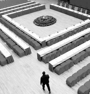 昨日下午,朝阳团团会审议政府工作报告。会前,工作人员将会场布置得井井有条。记者 郭铁流 摄