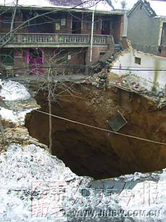 一个深20多米、直径20多米的洞口,赫然就在村路上。洞口的民房,大门围墙和厨房还有楼梯间都没了,只留下东面一面墙。“当时我们还以为是地震呢。”大坑南面的民房虽未受损,但住路北的王女士提起这件事仍心有余悸。王女士说,21日天黑时,就听到有响动,声音像刮大风。再后来,房子的窗户玻璃一会儿一抖,家里的灯泡也开始晃。“也记不清啥时候,就听到一声闷响,开门一看,对面住的人慌着往外翻墙,有的只穿条秋裤!没多大会儿,刚翻过的墙就开口了,接着塌陷了……”
