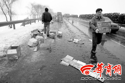 陕西一高速车祸现场:司机忙救人 路人忙抢苹果