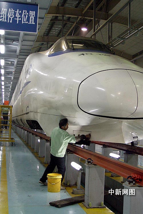 记者看到,在“CRH2—014A”动车前,十六名保洁工正对车体进行“洗澡”清洁,机务段的师傅对车轮和制动装置进行“体检”检修,客运段的姑娘们也开始对车厢进行“美容”。