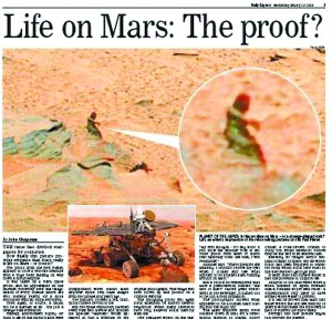 这张令人惊讶的火星照片显示,在红色星球的一处山坡上,一个脑袋硕大、如同“大脚怪”的黑色身影正挥着手臂走下火星山坡,它看起来又像是正坐在一块石头上休憩,还有人称,照片上的“火星人”看起来像是一名女性。针对这幅“火星人”照片,英国《每日邮报》幽默地评论说:“她坐在一块岩石上,像在等一辆公共汽车,不过如果真是这样的话,她可能得面临永无止境的漫长等待。”《泰晤士报》则将这个“火星人”比喻成是藏得无影无踪的本·拉丹:“它是一块岩石,还是火星光线的错觉?或者是本·拉丹在远离地球3亿英里远的荒芜藏身处朝地球挥手?”