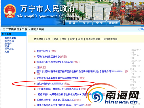 记者打开万宁市人民政府网站时,在首页上点击进入万宁信息供应平台,在该平台上的“南药瓜果”栏目的第六条信息中,记者发现“迷幻药蒙汗药13082***905[供应]”的信息。点击进入时,里面的内容非常详细。不但介绍了香港GHB粉、香烟型迷药、喷雾型迷药等各类迷幻药蒙汗药的成分、价钱、服用方法,还标明了服用后的反应。该信息还称,“诚信交易,货真价实,无效退款!!!严禁一切诈骗分子复制本公司广告!!!本公司本着信誉第一,效果保证,诚信经营的原则,真诚与全国各地朋友长期合作,真正需要货的朋友,请注意,提防骗子用低廉价格寄假货,来骗取你们急需等着用货的人,请不要贪小便宜而上当,效果那么好,能卖你两三百元,四五百元吗?我们的药虽然比别人贵了点,但效果绝对保证达到我们广告所说那种效果,货到你们当地你试一下,你就知道我们的药效和信誉。本公司奉劝那些网络骗子。不要再骗那些真的需要药的朋友了,都是在外面混的人。少做点让人骂的事。也劝没有货的商家,我这里有大量的货可以批发给你们,你找不到进货渠道。可以在我这里拿,你要的量大。我们可以谈。批发的价钱可以给你去卖,并且比你骗别人的那点钱,赚得多,诚信经营生意越做越大,欺诈客户生意越做越小。欢迎来电洽谈合作。”