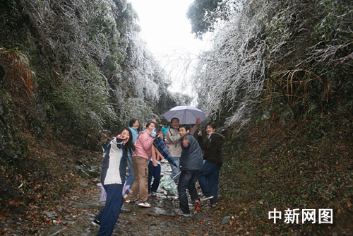 在远近闻名的梅关古道两侧,目光所及都是一片银枝玉叶、冰挂雾凇,树上早已绽放的千姿百态、婀娜多姿的白梅、腊梅、绿梅与晶莹的冰雪花交辉相映,让人眼花缭乱。在“岭南第一关”门楼前,一群群年轻人丝毫不惧严寒,或相争取景拍照留影,或尽情玩耍放声大喊。“真是意外的惊喜,没想到这次到南雄来休闲正好遇上了这场雪。古道踏雪赏梅还是第一次”一群从广州来的游客兴奋不已地告诉记者。