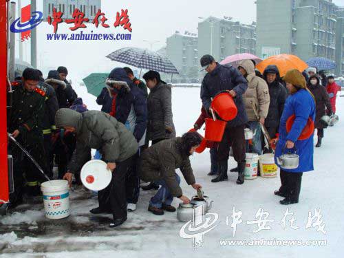 受暖湿气流和冷空气的共同影响,25日以来,安徽省铜陵市再次出现连续性强降雪,气温也继续下降,最低达零下4℃,全市出现了长时间的凝冻天气。从26日上午开始,市内多条供水主管道相继被冻结或爆裂,上万居民陷入了无水可用的困境。铜陵市消防支队及时启动了雨雪灾害抢险救援应急预案,先后出动4辆消防车、20余名官兵,冒着大雪和严寒,往返于取水点与居民区之间,为居民们送来了12车、共70吨清水,解决了居民们的燃眉之急。