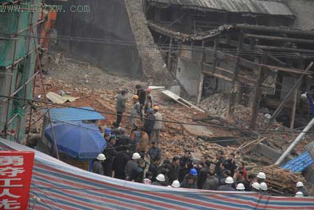 昨天12时左右,福州闹市一拆迁工地发生一起老墙坍塌事故,当场压死一名过路人,另有至少两名拆迁工人受伤。