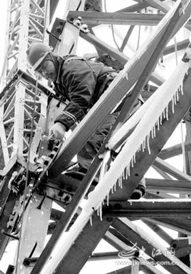 维修人员在布满冰雪的铁塔上工作