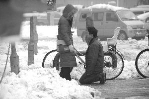 昨天上午,在南京迈皋桥广场上,一女子与男友发生矛盾后,当众连抽男友十几个耳光,还逼其跪在雪地里长达半小时。