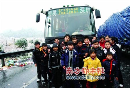 “记者同志,救救我们吧,我车上有20多个小孩!”昨日上午10时30分左右,南方都市报记者姜锵和徐文阁正在京珠高速公路受灾最为严重的广东省韶关市坪石入口附近采访,一位穿着绿色军大衣面容憔悴的司机,拦下了记者的采访车。
