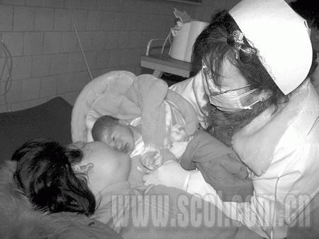 妇产科内,走廊上摆满了蜂窝煤灶,上面烘烤的全是婴儿的尿布。待产室门外,一个花甲老妇和一名中年男子,正焦虑不安地徘徊,不时通过门缝往里看。原来,花甲老妇名叫朱惠富,是产妇张大先的母亲。中年男子胡成,是张的丈夫。“幸好医院有台大功率的发电机哟,要不然我媳妇和娃娃可惨了。”胡成说,“我媳妇进去都1个小时了,还没消息,急死人了。”“你想要个儿子还是女儿?”“儿女都一样,只求母子平安。我把名字都给他们取好了,如果生的是儿子,就叫胡斌。女儿,就叫胡蝶。”