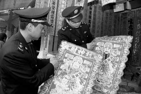 执法人员立即让该店停止销售行为,质问其是否知道把人民币图样印在年画上是违法行为时,店家连说不知道,说年画上印上人民币就图个吉利。在随后的检查中,执法人员发现许多年画上都印有人民币图样,而店家却无一知晓这是违法行为。“我们只是觉得吸引客人,大家都图个财源滚滚,真不知道这是违法的。”一家年画店的张姓老板说。