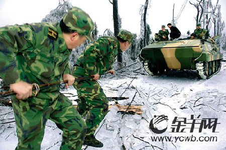 图:广州军区某部紧急派出官兵和两辆装甲运输车以及推土机、大卡车等奔赴受灾山区,一路上,领导带头挥舞榔头、铁铲奋力破冰开路。