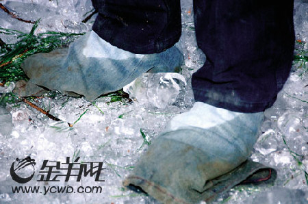 图:路面上结了十多厘米厚的冰层,村民在鞋外包布防滑。