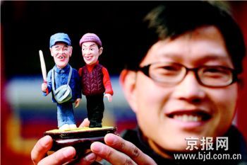 喜剧明星赵本山和宋丹丹今年春晚合演的《火炬手》那对可爱的东北老头老太形象给观众再次留下了深刻的印象。这不,昨天,南京一位巧手的市民陆文著在民俗手工艺表演展示会上,用面捏出了“白云和黑土”,将戴着标志性蓝色八角帽的赵本山以及豁牙却自信的宋丹丹塑造得惟妙惟肖,再添上一旁的奥运火炬“筋斗云”做道具——让人忍俊不禁。