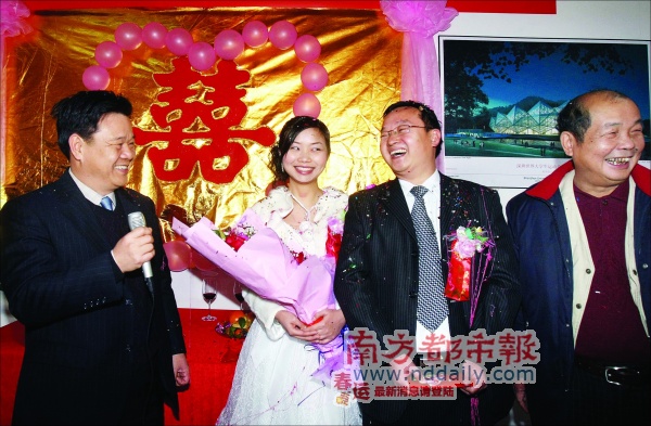 而得知这一消息后,昨日到施工工地慰问建设者们的吕锐锋和梁道行两位副市长,为新人们当了一回特殊的证婚人,除了给新人包上两个大红包,两位副市长都祝愿新人爱情美满,白头偕老。