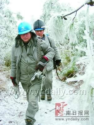 严重冰冻灾害天气让曲靖很多地方的电网面临严峻考验。沾益县的冰冻尤为严重,辖区电力设施损坏十分严重。在电力抗灾抢险现场,记者看到厚厚的覆冰把电线压塌,有些电杆被拦腰折断。
