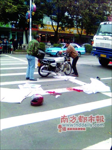 下午1时40分,死者被殓尸车运走。记者看到,死者为一女子,年龄在30岁左右,头部有被轧过的痕迹,地面上留有两摊鲜血。在工作人员掀开纸箱后,记者看到倒地的摩托车为一辆男式警用摩托车。