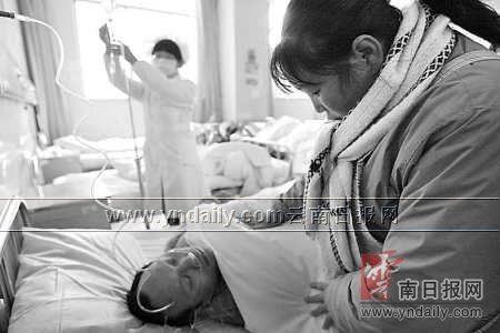 下午3时,在延安医院急诊科,记者看到李贤友面色惨白,安静地躺在病床上打着点滴。李贤友说他头很疼、很晕,他的背部有明显的红色血印,病床旁边的垃圾箩里有他的呕吐物。李贤友的妻子张丽说,送到医院后他先后吐了四五次。