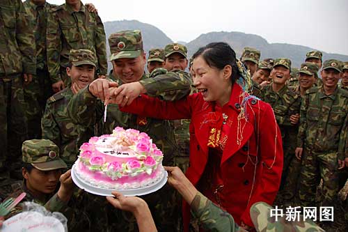 这是一场没有红地毯和鼓乐队的婚礼。贺大明所在的连队正在执行任务,一大早官兵们都上山运送电线杆。在半山一处缓坡的路旁,新郎和新娘到场后,战士们停下工来观礼——由连队主官宣读结婚证书,俩人互赠信物、行鞠躬礼、喝交杯酒、同切蛋糕、分发喜糖,婚礼一气呵成,简单而不失庄重。