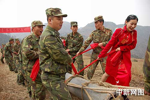 中新网韶关2月25日电(冯昶 李凌 胡继军)24日,在广东韶关乐昌市秀水镇杨南面村抗冰复电抢修现场,一场别开生面的婚礼在此举行。驻韶某部连副指导员贺大明和他的新娘张秋菊在官兵们的鼓掌欢呼和祝福中喜结连理。
