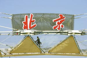 昨日,机场南线高速收费站,工人在进行最后的安装。记者 浦峰 摄