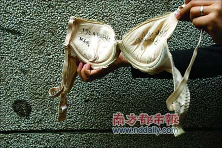 昨天早上8点,李小姐开门发现自己丢失的一件胸罩摆在门外,而这并不是前晚丢失的,是2月17日失踪的那个。李小姐说,这个胸罩当时是新买的,现在被送回后却变形得很厉害。更让她吃惊的是,内衣里边有留言,左右写着同一个手机号码,一边写着“联系我”,另一边则写着“MM来电”,还画有一个心形图案。