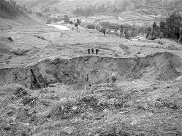 近日,达州达县大风乡白果村一带陆续出现土地沉陷,形成不少“天坑”(上图),最大的直径超过10米。目前“天坑”形成原因不明,国土部门正在进一步调查。