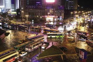 记者在现场看到,大水从十字路口东北角一处三角绿化带的路面涌出,冒起的“喷泉”长宽都有2米左右,高0.5米。马路上水最深处约40厘米左右,公交车仍能冒险通过,公交司乘人员将车靠近已经被水淹没的人行道,用手挨个将乘客拉到车上。香港中路两侧的商场超市因地势较高,并未进水。