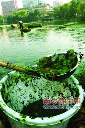 工作人员正在打捞流花湖内的蓝藻。李向新摄